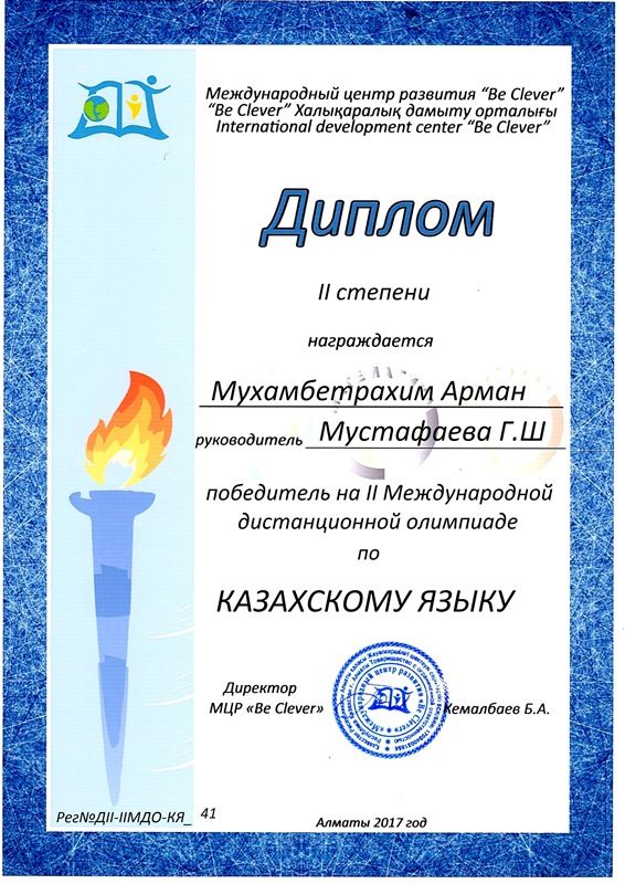 "Be Clever" Халықаралық дамыту орталығының ұйымдастыруымен қашықтықтан өткізілген ІІ Халықаралық пән олимпиадасының жеңімпаздары: Қазақ тілі пәні бойынша  І дәре…