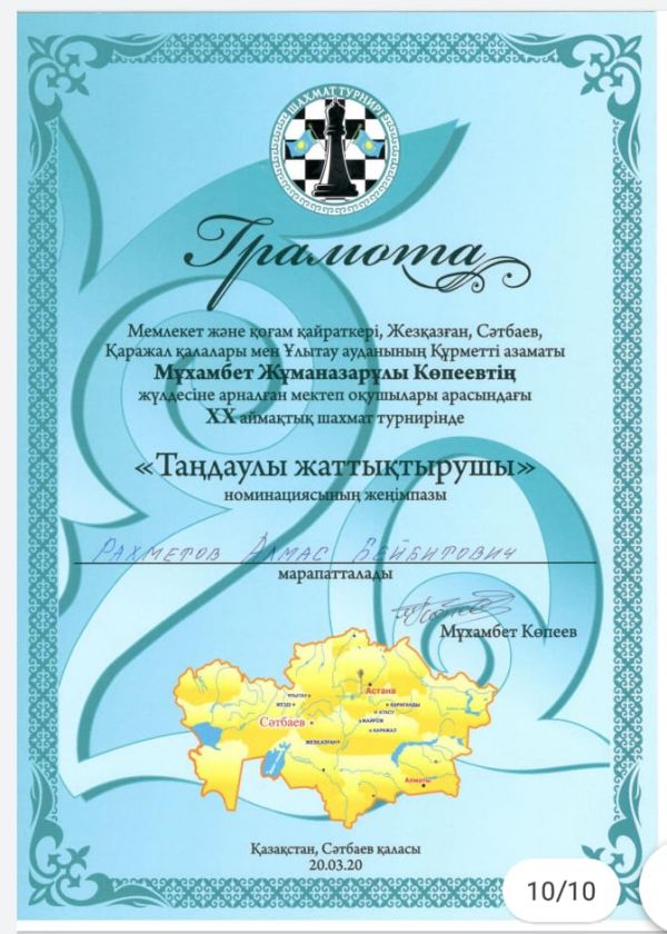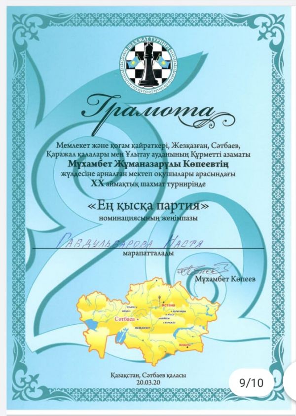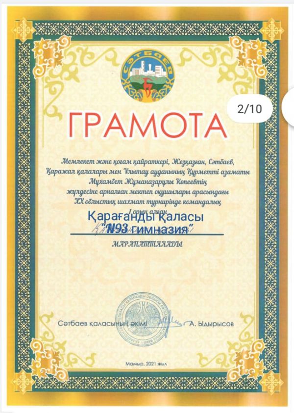 Қарағанды қаласы, 93 гимназияның зерек те алғыр, жігерлі де зияткер оқушылары ГАБДУЛЬБАРОВА АНАСТАСИЯ, МУКАШЕВ АРМАН, ТЛЕШЕВ НАРИМАН шахматтан Мемлекет жəне қоғам қайраткері Жезқазңан…