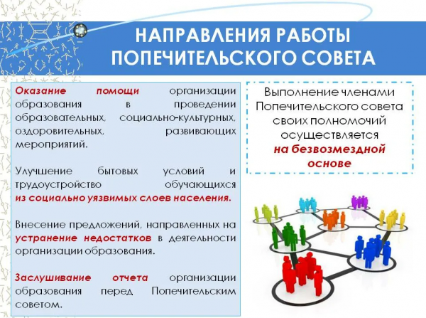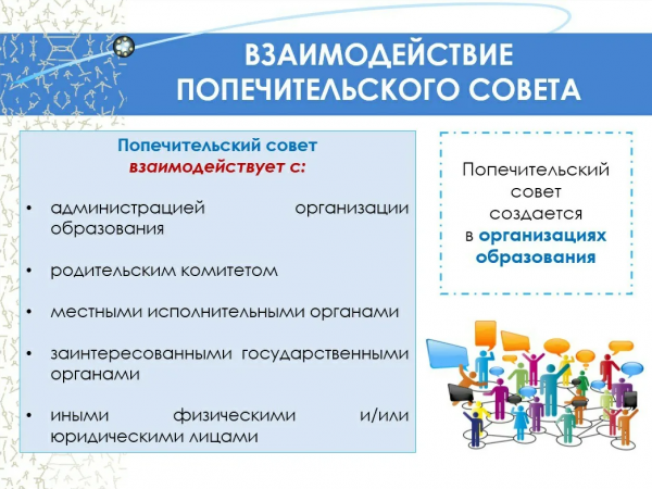 Қамқоршылық кеңес-білім беру мекемесінің жарғылық қызметін ұйымдастыруға көмек көрсету, мекеменің қаржы-шаруашылық қызметін қоғамдық қадағалау және оның материалдық-техникалық базасын нығайту мақсат…