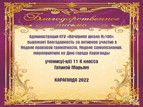 Қарағанды қаласының "№100 кешкі мектеп" КММ әкімшілігі мен ұжымы құқықтық сауаттылық апталығында, өзін-өзі тану апталығында, Қарағанды қаласы күніне арналған іс-шараларға белсенді қатысқан…