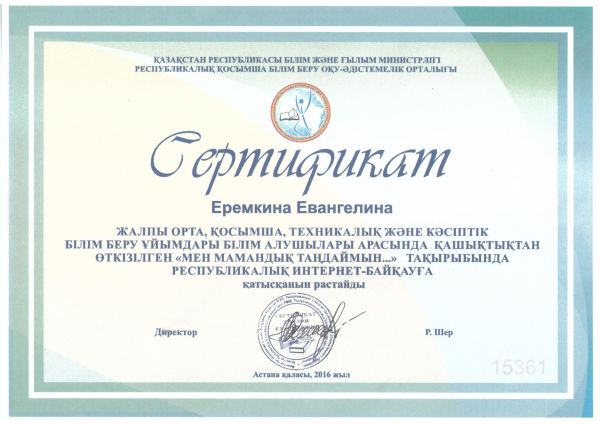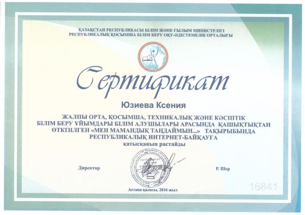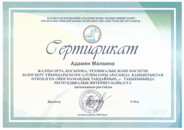 Біздің мектептің оқушылары балаларға арналған ғылыми-танымдық wwwziatker.org сайтында 2016 жылыдың қаңтар мен 10 наурыз аралығында өткен, «Мен мамандықты таңдаймын...»тақырыбында, респуб…