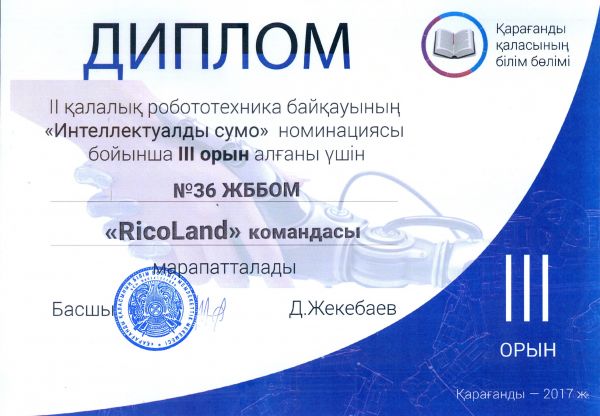 ІІ қалалық робототехника байқауының "Интеллектуалды сумо" номинациясы бойынша №36 ЖББОМ "RicoLand" командасы ІІІ орынға ие болды. Жетекшісі Ибраев Е.А