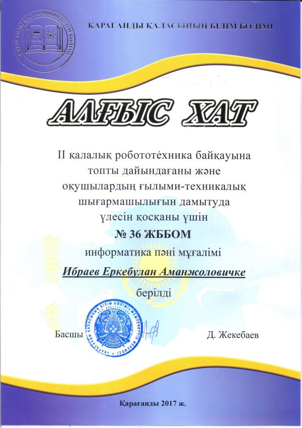 ІІ қалалық робототехника байқауына топты дайындағаны және оқушылардың ғылыми-техникалық шығармашылығын дамытуда үлесін қолсқаны үшін №36 ЖББОМ информатика пәні мұғалімі Ибраев Еркебулан Аманжоловичк…