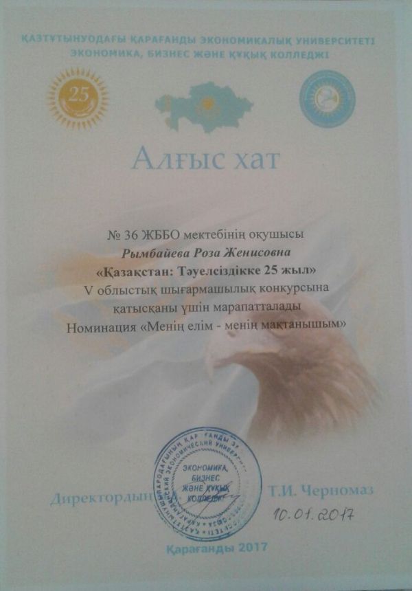 "Қазақстан: Тәуелсіздікке 25 жыл" V облыстық шығармашылық конкурсынақатысқаны үшін №36 ЖББОМ оқушысы Рымбаева Роза Женисовна алғыс хатпен марапатталды. Пән мұғалімі Байпакбаева К.К