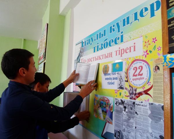 Мектебімізде «Тіл – достықтың тірегі» атты көрме ұйымдастырылып, көрмеге 9 «В» сынып оқушылары шақырылды. Оларға бағдарламаға сай тақырыптар бойынша қазақ тілі мен әдеб…