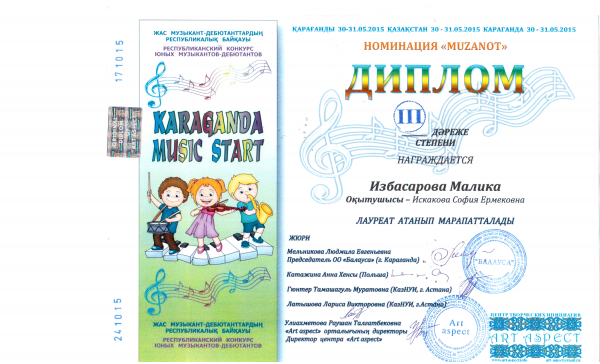 30.05.15 күні Қарағанды қаласының № 2 өнер мектебінде Арт Аспект шығармашылық орталығының ұйымдастыруымен, «Караганда мюзик старт» атты байқаудың «МузаНот» номина…