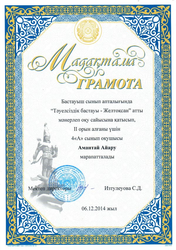 Бастауыш сынып апталығында «Тәуелсіздік бастауы - Желтоқсан» атты мәнерлеп оқу сайысында  4 «А» сынып оқушылары Амантай Айару, Асқар Аяулым  ІІ орын алғаны…