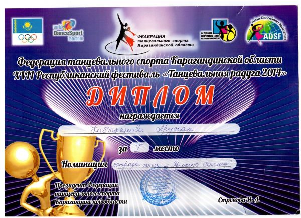 Қарағанды обылысы би спорты Федерациясы өткізген ХVІІ Республикалық «Танцевальная радуга 2014» фестиваліне қатысып 6 сынып оқушылары Қабыкенова Аружан, Омарова Дильназ, Нуршабекова Лейла…