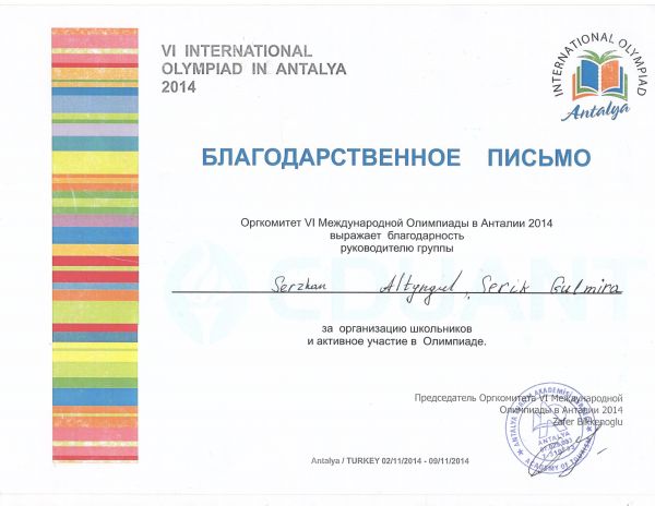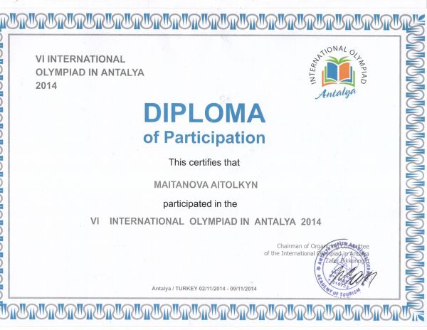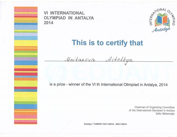 Мектебіміздің 11 "Б" сынып оқушысы Майтанова Айтолқын Түркия мемлекетінің Анталия қаласында өткен VI халықаралық олимпиадаға қатысып, жүлделі орынға ие болып, дипломмен және медальмен мара…