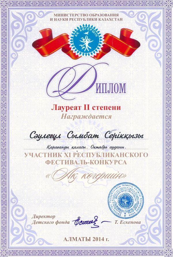 03.11.14 - 08.11.14 аралығында Алматы қаласында өткен ХІ Республикалық «Ақ көгершін» байқауына 9 «Б» сынып оқушысы Мұқанов Диас қатысып, ІІ дәрежелі дипломант атанды. 8 &laqu…