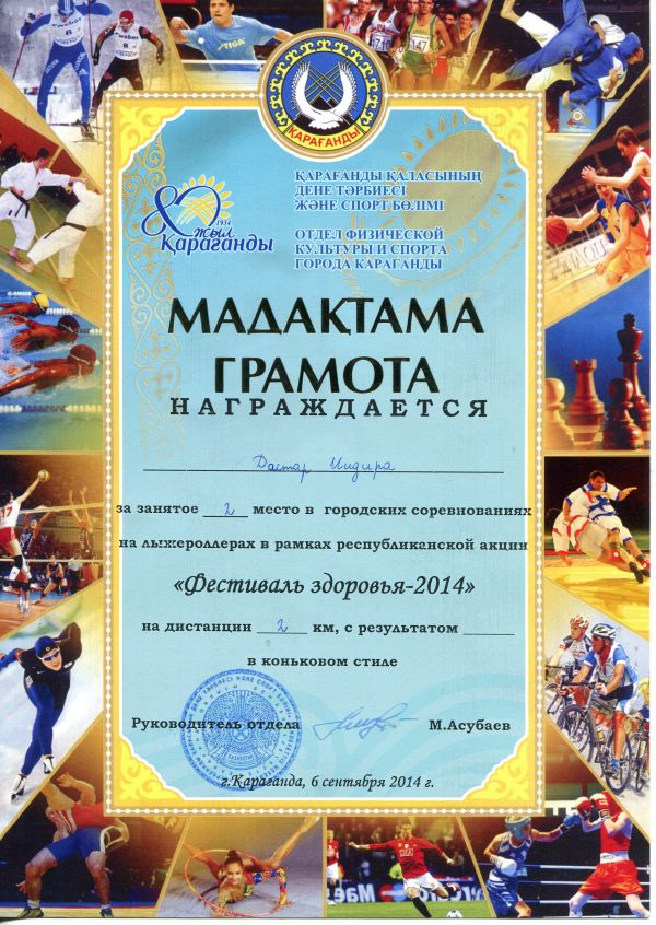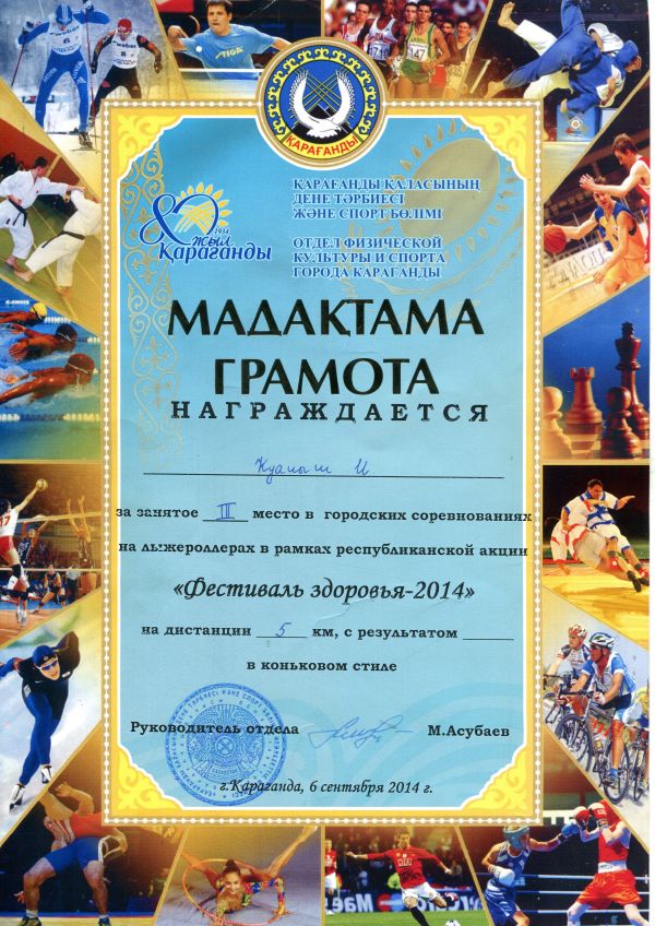Награждается Қуаныш И , Дастар И за занятое ІІ место в городских соревнованиях на лыже роллерах в рамках республиканской акции "Фестиваль здоровья-2014" на дистанции 5 км, с результатом в…
