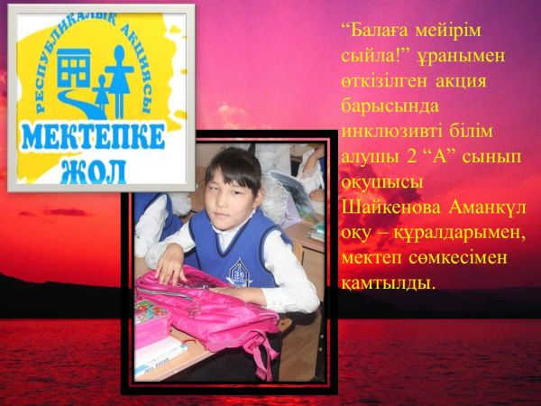 “Балаға мейірім сыйла!” ұранымен өткізілген акция барысында инклюзивті білім алушы 2 “А” сынып оқушысы Шайкенова Аманкүл оқу – құралдарымен, мектеп сөмкесімен қамтылды.…