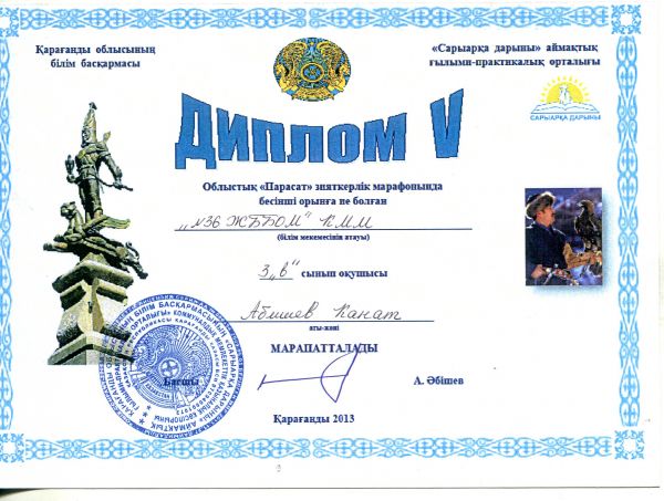 Облыстық "Парасат" зияткерлік марафонында 3 "в" сыныбының оқушылары Темірғалиева Саяжан ІІІ орын, Рымбекова Құралай IV орын, Мукатаева Альшарапи V орын,Абишев Канат V орынға ие б…