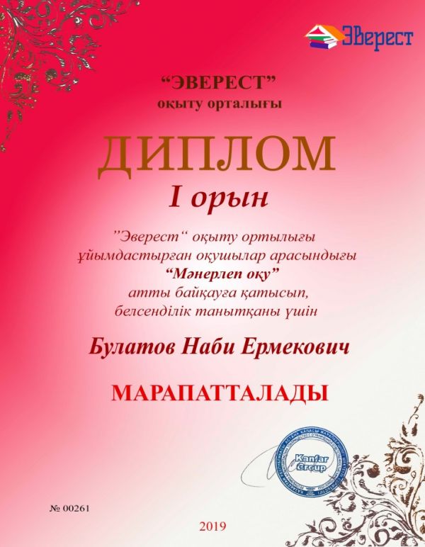 Оқушылардың республикалық олимпиадасы 2018-2019 ІІ (қалалық) кезеңінде орыс тілі мен әдебиет пәнінен 8 «Ә» сынып оқушысы Тусупбекова Айкерим 1-орынға ие болды.