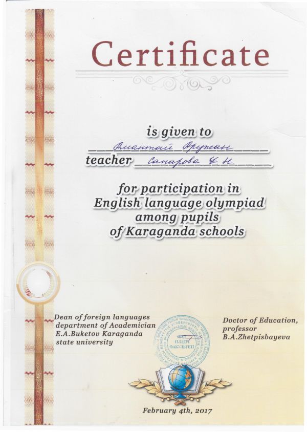 «Қазақстан Ұстаздары» қоғамымен ұйымдастырылған «Бастауыш сыныптар» пәні бойынша республикалық қашықтық олимпиадаға қатысып,жоғары көрсеткітерді иеленгені үшін 4 «А&raq…