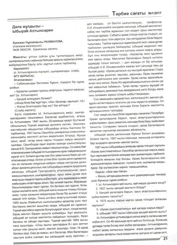 "Тәрбие сағаты" журналының 2017 жылғы бірінші  номерінде  7 "Б" сынып жетекшісі Т.У. Тайжанованың "Жаса Қазақстан" атты тәрбие сабағы және кітапхана меңгеруші…