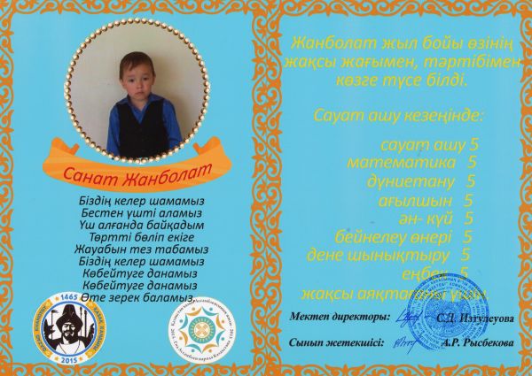 23.05.2015.ж мектепте өткен үздіктер шеруіне 1 «Б» сыныбынан белсенді, озат, ерекшекөзгетүскен оқушылар қатысып, «Мақтау қағазымен» марапатталды