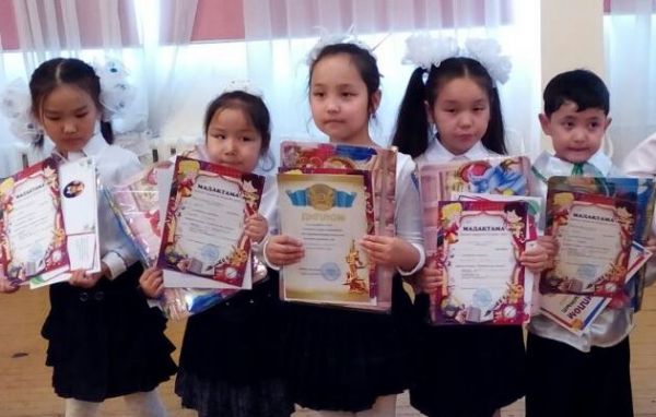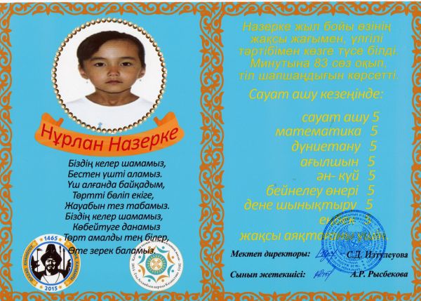 2014-2015 оқу жылының мектепішілік жылдық байқау қорытындысы бойынша әдеби кітаптарды сүйіп оқығаны үшін 4 «А» сыныбының оқырмандары Амантай Айару, Серікбай Бану, Жұмакә…