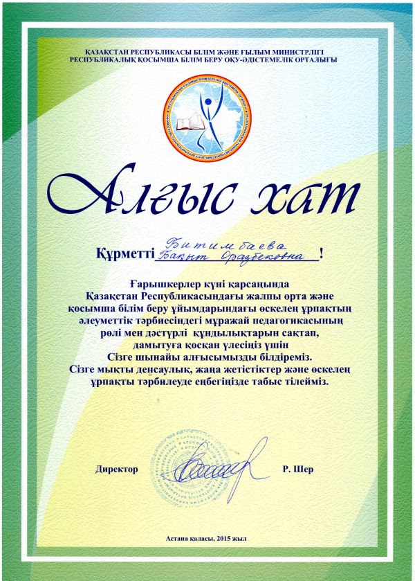 «АУҒАН СОҒЫСЫНА ҚАТЫСҚАНДАРДЫ ЕСКЕ АЛУ» АТТЫ ОБЛЫСТЫҚ СУРЕТ БАЙҚАУЫНА ОҚУШЫЛАРЫН ДАЙЫНДАҒАНЫ ҮШІН БАСТАУЫШ СЫНЫП МҰҒАЛІМІ СЕКСЕНАЛИНА ДИАНА АЛҒЫС ХАТПЕН МАРАПАТТАЛАДЫ.