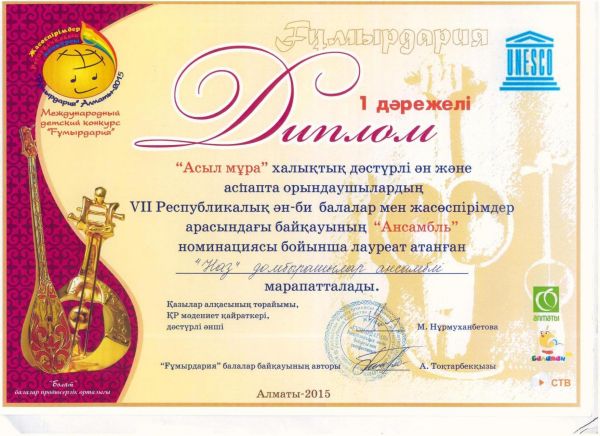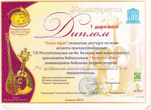 Халықаралық «Ғұмырдария» конкурсында «Асыл мұра» халықтық дәстүрлі ән және аспапта орындаушылардың VII Республикалық ән-би балалар мен жасөспірімдер арасындағы ба…