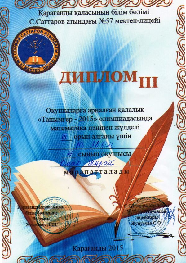 «Танымгер-2015» олимпиадасында математика пәнінен III орын , Тлеужан Айсұлу осы олимпиад…