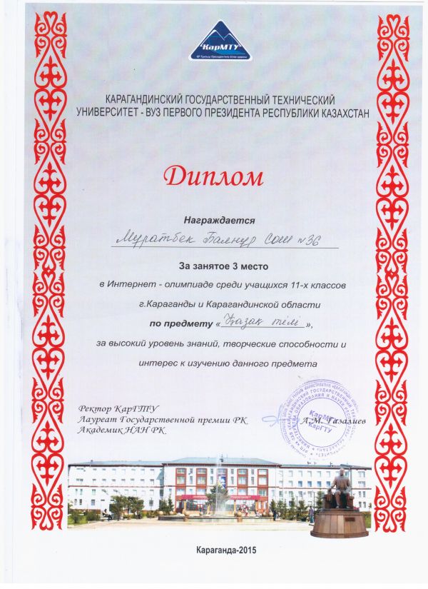 №36 Жалпы білім беретін орта мектептің 9 "А" сынып оқушысыКойгельдина Жадыра "Энергия - кеше, бүгін, ертең" облыстық шығармашылық сайысына қатысып, ІІІ орынға ие болғаны үшін мар…