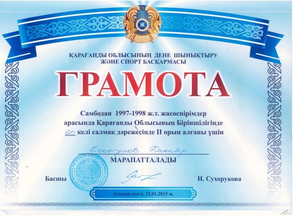 11 «А» сынып оқушысы Есенгулов Данияр самбодан жасөспірімдер арасында Қарағанды облысының біріншілігінде 60 келі салмақ дәрежесінде 2-орын алғаны үшін грамотамен, дзюдодан осы салмақ дәр…