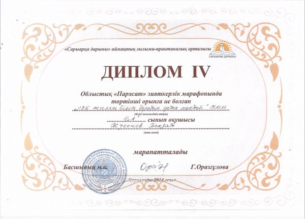 4 «в» сыныптан 7 оқушы Облыстық «Парасат» зияткерлік марафонына қатысып, Дипломмен марапатталды.