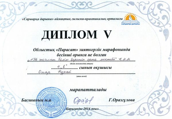 «Ақ бота-2014» интеллектуалдық марафонында 5 «Б» сынып оқушысы Таубаева Гүлнұр ІІІ орынды иеленді.