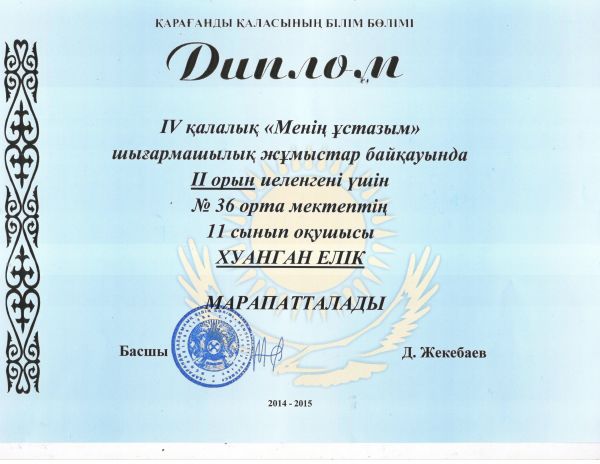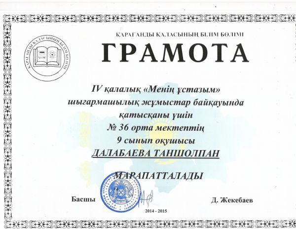 IV қалалық "Менің ұстазым" шығармашылық жұмыстар байқауында ІІ орын иеленгені үшін №36 орта мектептің 9-11 сынып оқушылары Далабаева Таншолпан мен Хуанган Елік марапатталады.