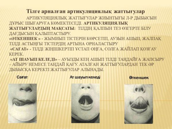 Артикуляциялық жаттығулар жиынтығы Л-Р дыбысын дұрыс шығаруға көмектеседі. Артикуляциялық жаттығулардың мақсаты: тілдің қалпын тез өзгерте білу дағдысын қалыптастыру. «Әткеншек » - Жымиы…