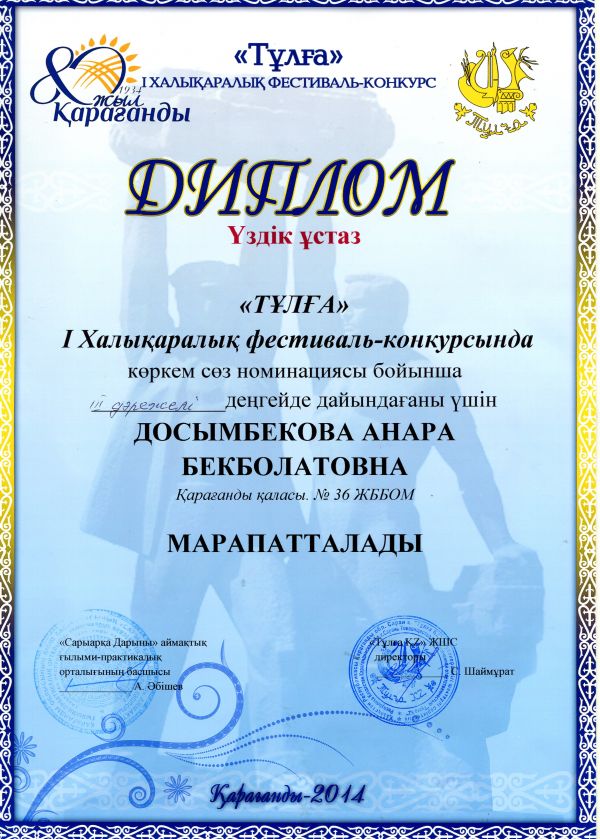 Қарағанды қаласының 80 жылдық мерейтойына орай ұйымдастырылған І ХАЛЫҚАРАЛЫҚ ФЕСТИВАЛЬ – КОНКУРСЫНДА көркем сөз номинациясы бойынша ІІІ -…