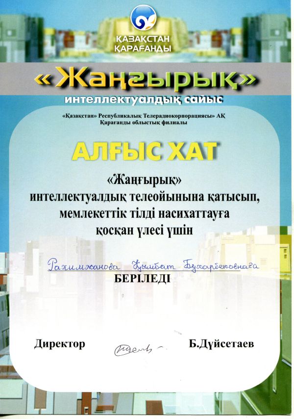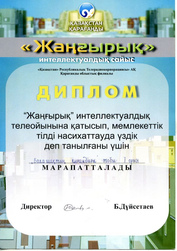 "Жаңғырық" интеллектуалдық телеойынына қатысып, мемлекеттік тілді насихаттауда үздік деп танылғаны үшін "Болашақтың қырандары" тобы І орын иеленіп дипломмен марапатталды.