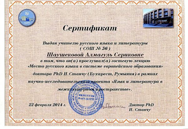 Выдан сертификат  учителю русского языка и литературы Шаушековой Алмагуль Сериковне в том, что она прослушала гостевую лекцию "Место русского языка в системе европейского образования"…