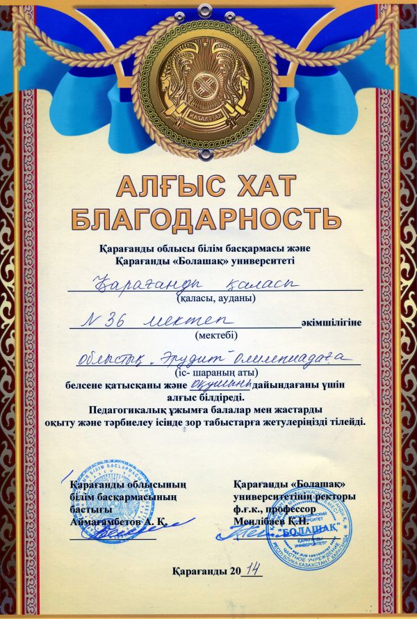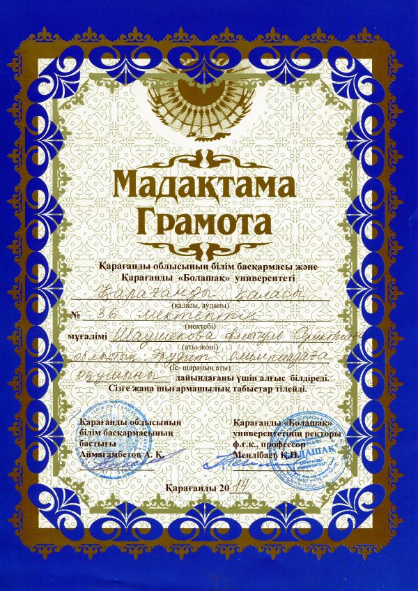 Филологический факультет КарГУ имени Е.А.Букетова выражает благодарность учителю русского языка и литературы СОШ № 36 Шаушековой Алмагуль Сериковне за подготовку призера Областной олимпиады по русск…