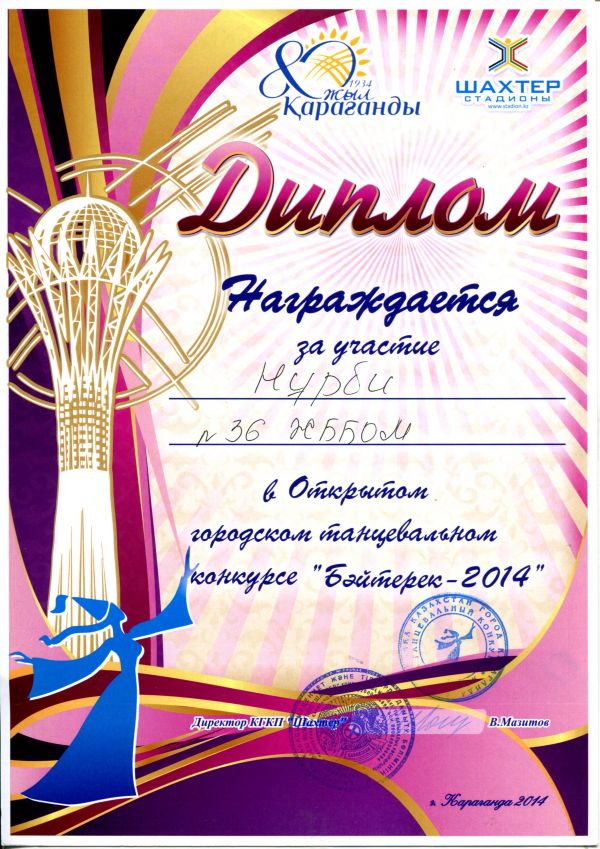 Танцевальный коллектив "НұрБИ" была награждена дипломам в номинации Лучший коллектив в Открытом городском танцевальном конкурсе "Бәйтерек-2014"