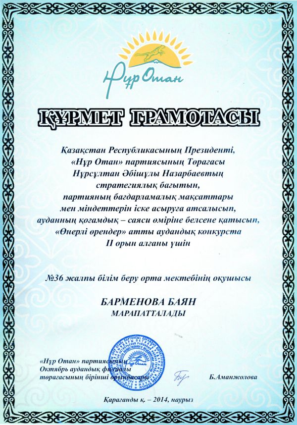 «Бәйтерек - 2014» қалалық би байқауына қатысып, 2 «Б» сынып оқушылары Айдарбек Дильназ, Қуандықова Жанель, Амангазы Мөлдір ІІ дәрежелі дипломмен марапатталды.
