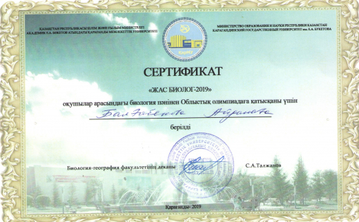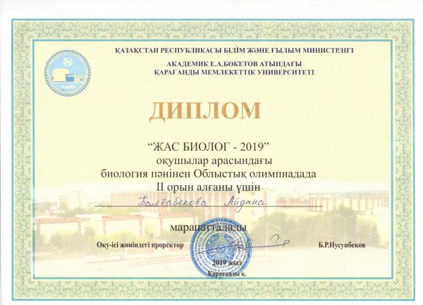 Академик Е. А. Бөкетов атындағы Қарағанды Мемлекеттік Университетінде өткен "Жас Биолог - 2019" оқушылар арасындағы биология пәнінен Облыстық олимпиадада Балғабекова Айдана ІІ-орын иеленді…