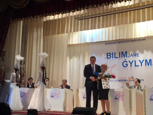 2019-2020 жылғы 28 тамыз  конференциясында    облыс әкімнінен « Қазақстан республикасыныңбілім беру ісінің құрметті қызметкері» төс белгісімен Мутатын Кулзира марапат…