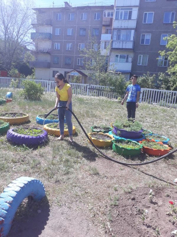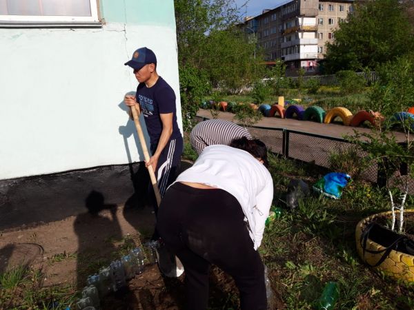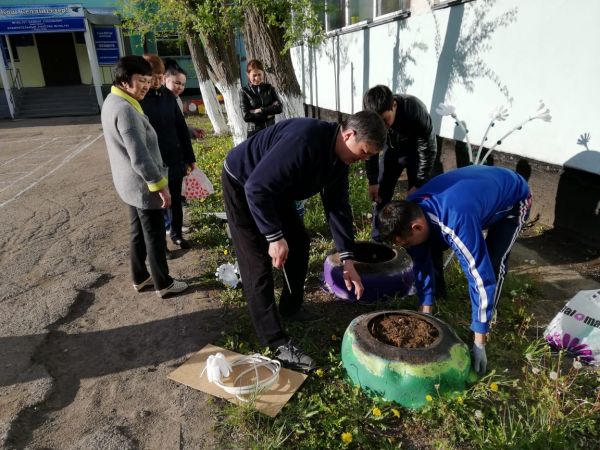 "Жасыл ел" бағдарламасы бойынша мектеп алдын көгалдандыру жұмысына оқушылар белсене қатысты.
