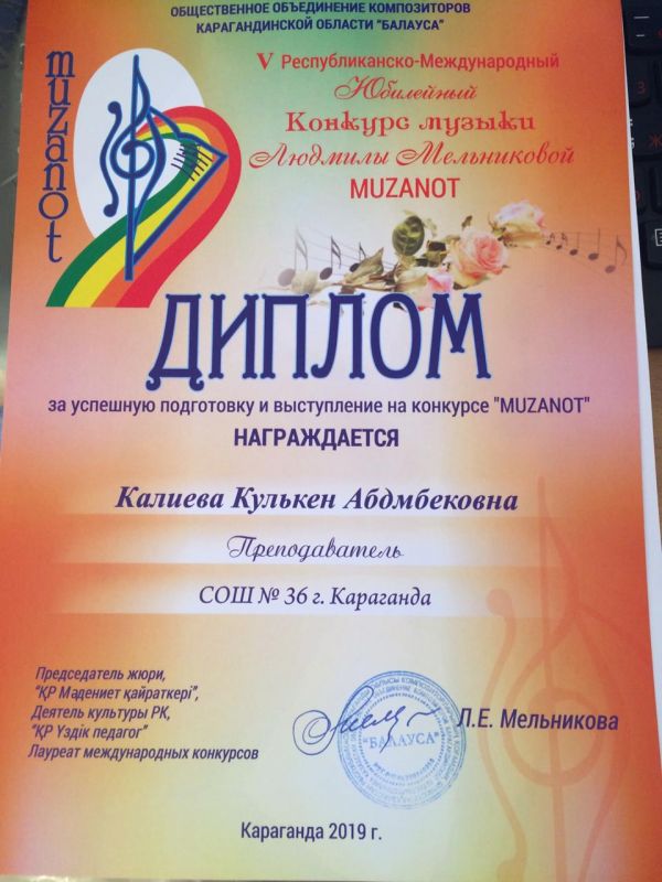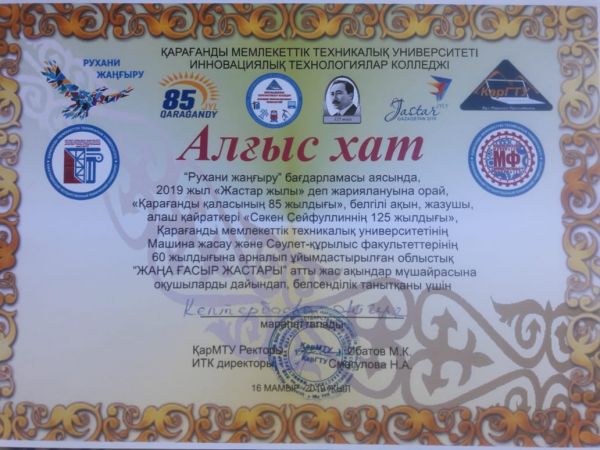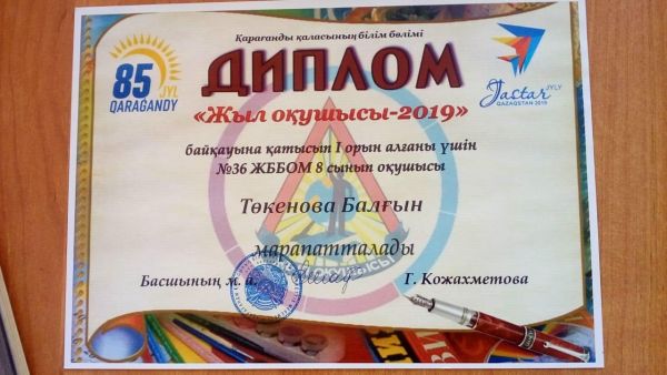 "Жыл оқушысы - 2019" қалалық байқауда 8"Ә" сынып оқушысы Төкенова Балғын 1-орынға ие болды. Сынып жетекшісі Заркеева Д.Н