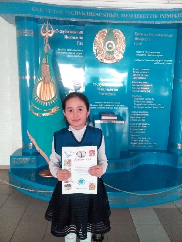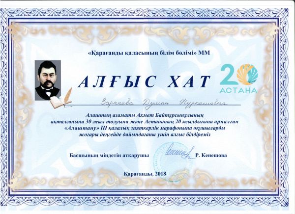 «Алаштану» ІІІ қалалық зияткерлік марафонына қатысқан 9 «А» сынып оқушысы Астабиева Айнұр ІІ дәрежелі дипломмен марапатталды.