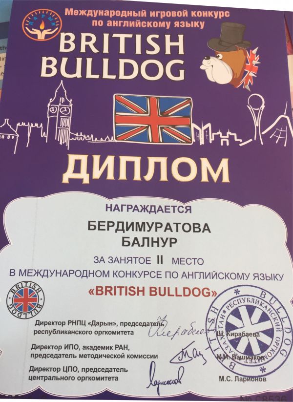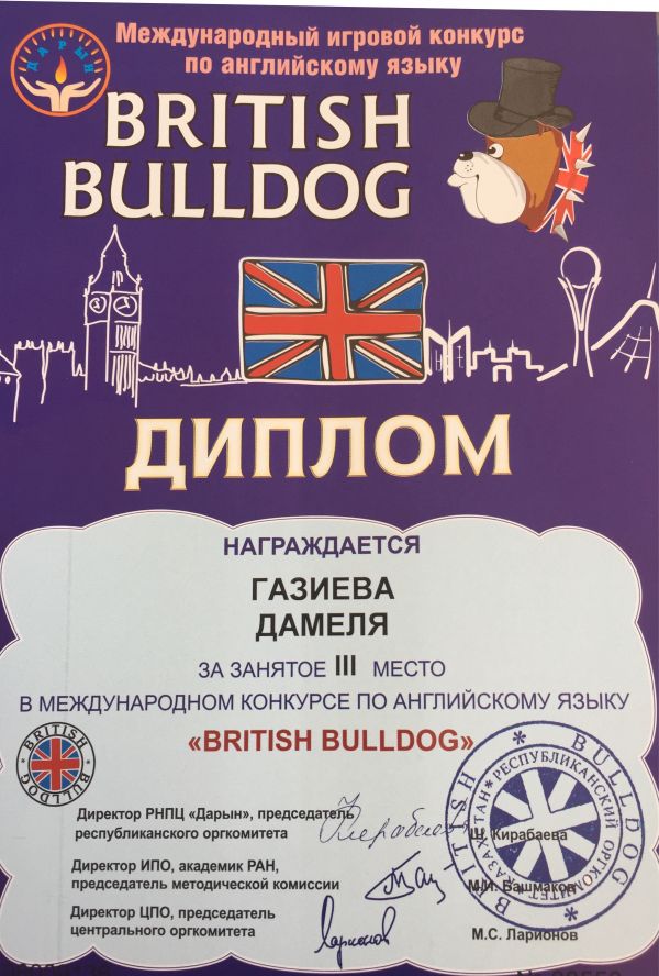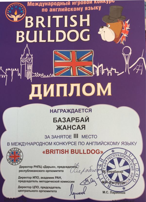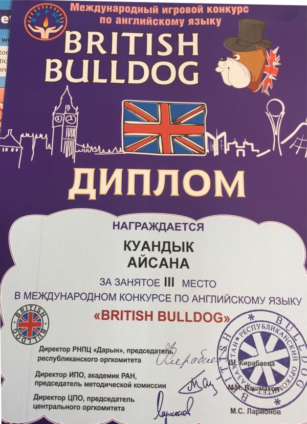 Ағылшын тілі бойынша "British bulldog" халықаралық конкурсқа мектебіміздің 4,5,6,7 сыныптарының 32 оқушысы қатысып, барлығы жүлделі 1,2,3-орын дипломдарымен марапатталды. Пән мұғалі…