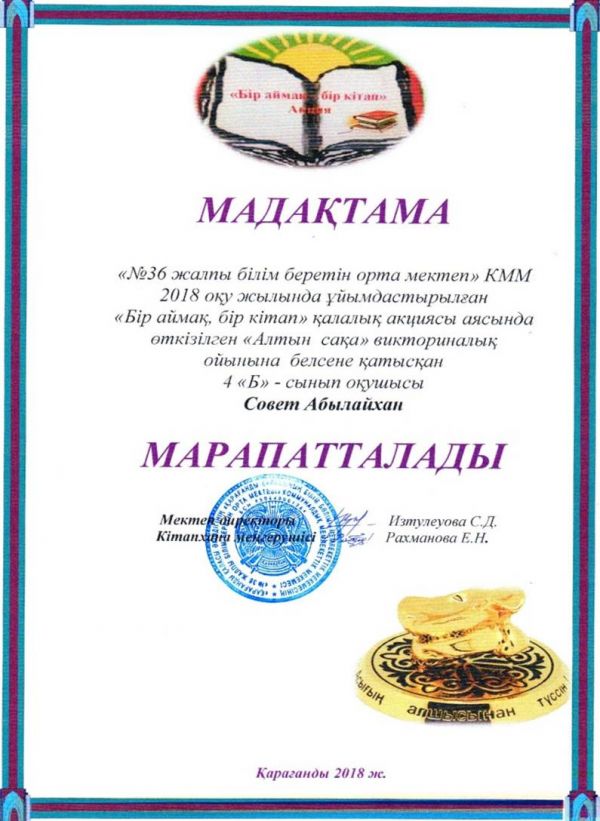 «Бір аймақ,бір кітап» қалалық акциясы аясында өтілген «Алтын сақа» викториналық ойында 4 «Б»сынып оқушылары үлкен белсенділік көрсетіп марапатталды.…