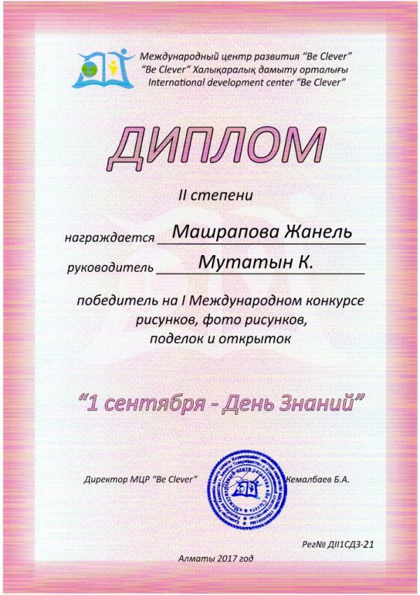 Халықаралық даму орталығы lntematfonal development center «Be Clever» сурет байқауынан 2- орын жеңпазы 5 сынып оқушысы Машрапова Жанель Дипломмен марапатталды.Жетекшісі…