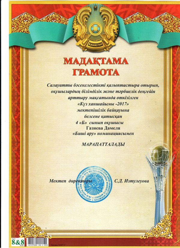 4 «Б» сынып Газиева Дамеля «Күз ханшайымы-2017» байқауында «Биші ару» номинациясы бойынша марапатталды.