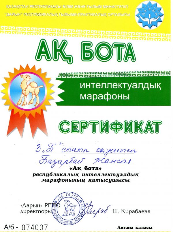«Ақбота» республикалық интелектуалдық марафонына ең алғаш қатысып отырған 3 «Б» сынып оқушылары Абишев А,Тукмачева А,Базарбай Ж , Амангелді К,Табарак Г…