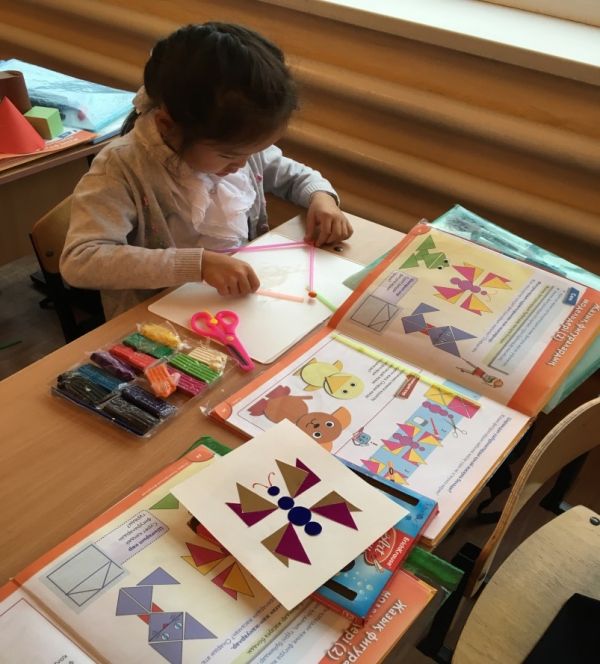 1 «А» сынып оқушылары математика сабағында «Жазық фигуралардың модельдері» тақырыбында композицияларды жазық фигуралардың үлгілерінен және олардың бөліктерінен жасады.
