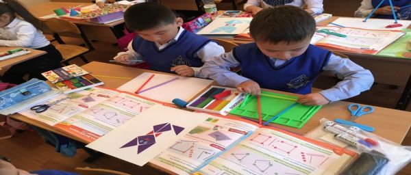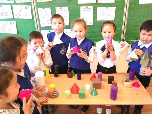 1 «А»сынып оқушылары математика сабағында «Жазық фигуралар» тақырыбында жазық фигураларды (үшбұрыш, шеңбер, шаршы, тік төртбұрыш)/ кеңістіктегі фигураларды (куб, шар, цилиндр…
