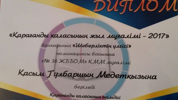 Қарағанды қаласы әкімдігінің ұйымдастыруымен өткен «Қарағанды қаласының жыл мұғалімі-2017» байқауының «Шеберліктің үлгісі» номинациясы бойынша «№36 ЖББОМ» КММ қаз…